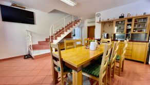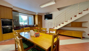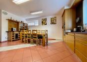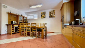 Prízemie rodinného domu tvorí miestnosť cca 80 m2 sektorovo oddelená kuchynská časť,  od jedálenskej časti a obývacej časti s kozubom. Pri tejto miestnosti je veľká kúpelňa s dvomi vaňami /jedna je obyčajná a druhá dvojmiestna s masážnými triskami/, sprchovacím kútom a fínskou saunou pre pre 8 až 10 osôb. Ďalšou miestnosťou v tejto časti domu je izba, momentálne zariadená ako detská izba.