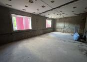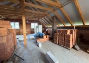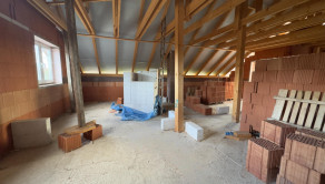 Aktuálne dispozícia zahŕňa predsieň, kuchyňu, kúpeľňu s WC a veľkú obývačku s komínom Leier. V podkroví sú plánované ďalšie izby, pričom z jednej vedú terasové dvere na budúcu terasu s výhľadom do záhrady.