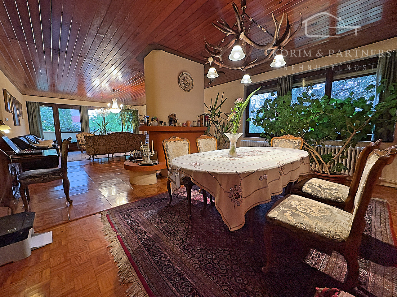 Poslednou a najväčšou miestnosťou domu je priestranná obývačka s jedálňou. Jej dominantným prvkom je netradične umiestnený kozub, ktorý okrem tepla, vydáva upokojujúci zvuk praskajúceho dreva a oheň príjemne osvetľuje zvyšnú časť obývačky. Za kozubom je už spomenutá jedáleň so stolom pre 6 osôb. Zadná časť obývačky je celá presklená terasovými dverami, vedúce na hornú terasu s výhľadom na ulicu.