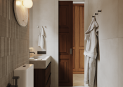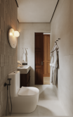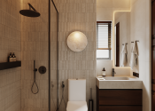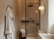 Kúpeľňa so sprchovacím kútom, umývadlom a WC
