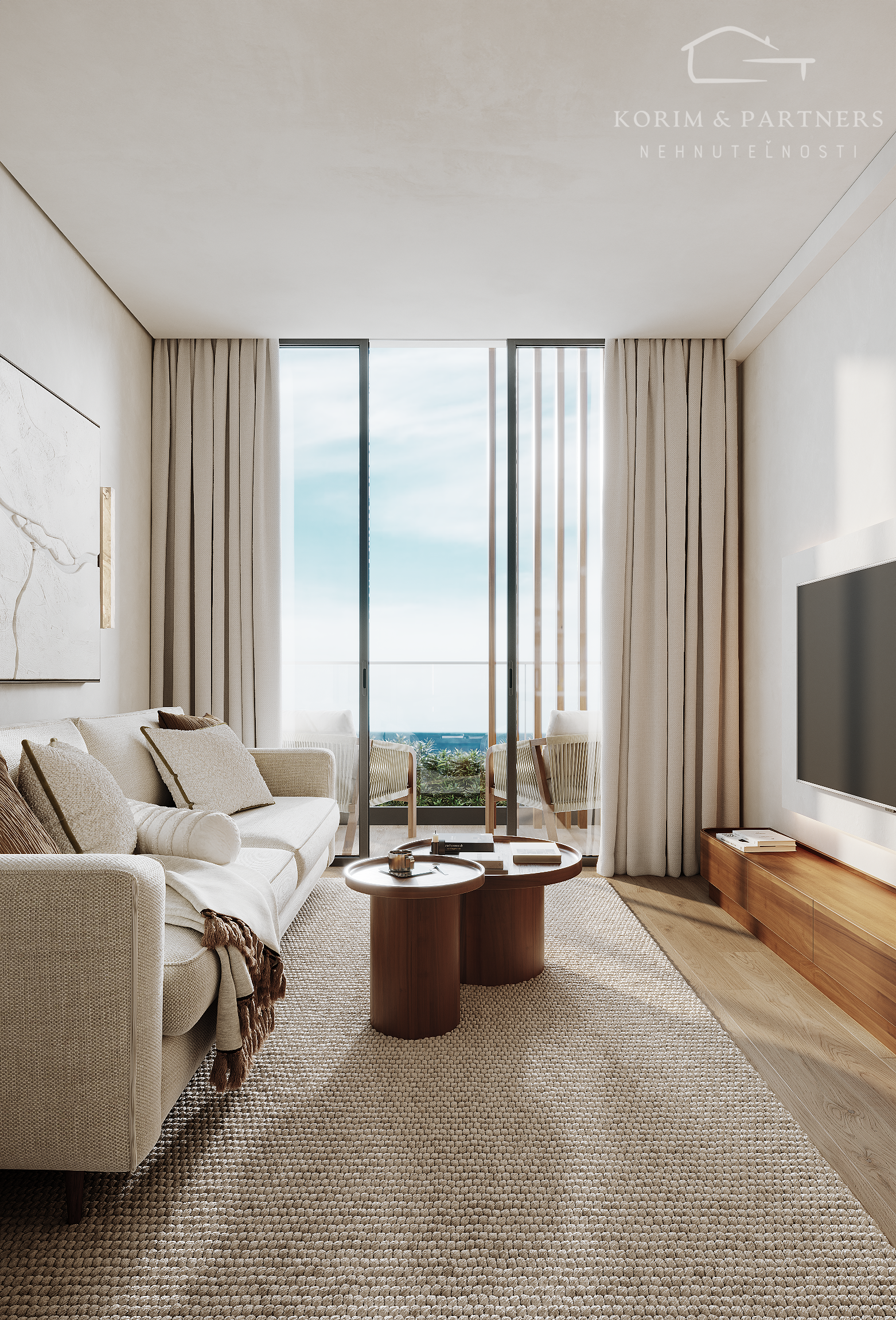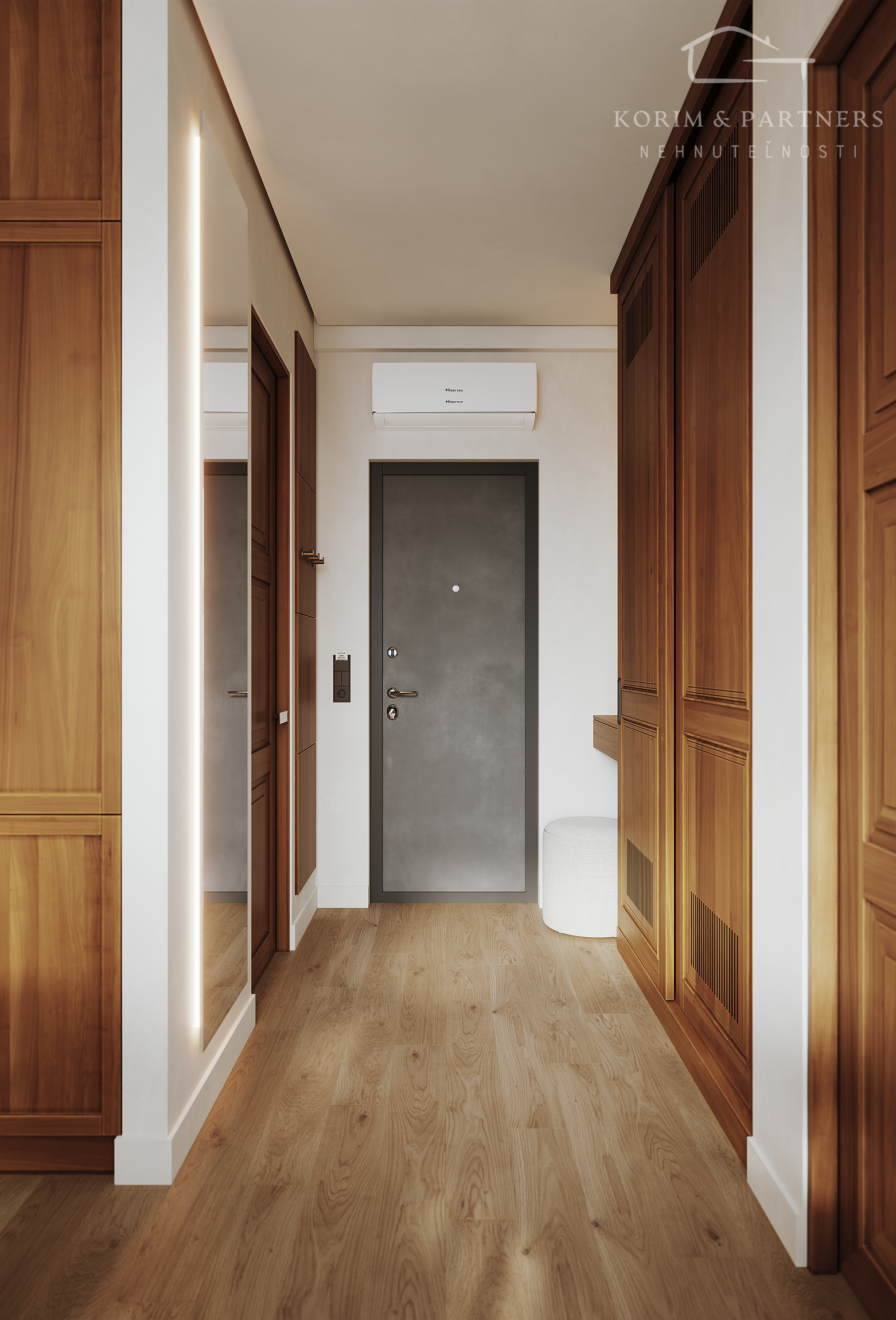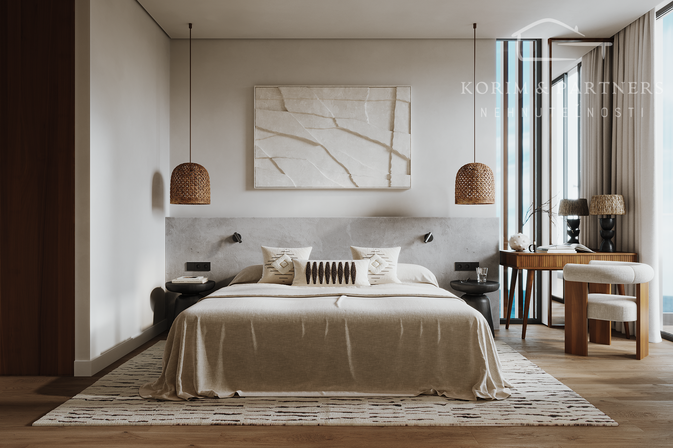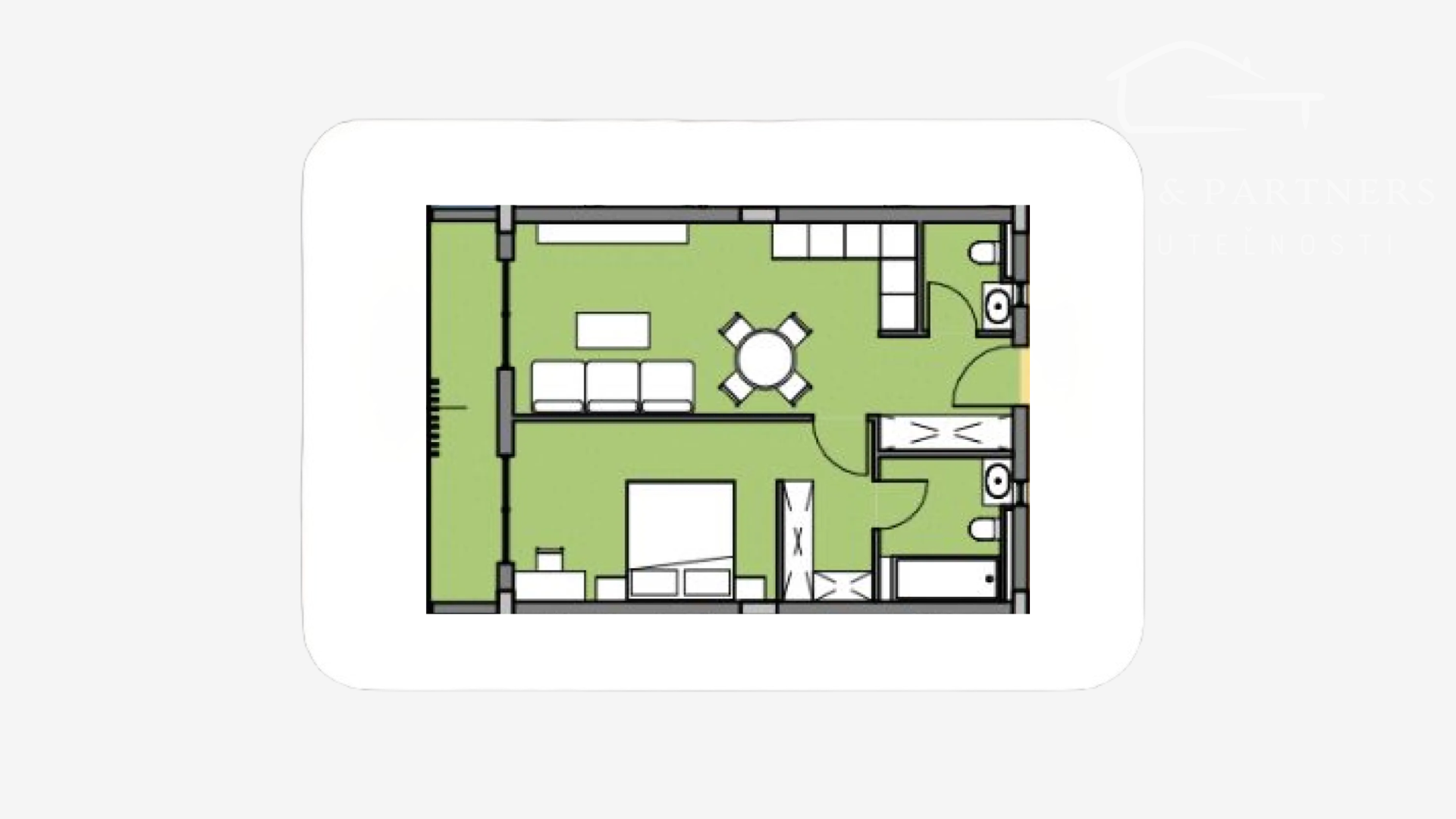 Tento moderný apartmán pozostáva z predsiene, pri ktorej sa nachádza samostatné WC. Prechod z preciene Vás privedie plynulo do kuchyne spojenej s obývačkou, na ktorej konci sa nachádzajú panoramatické okná s posuvnými dverami, ktoré vedú na balkón, na ktorý je zároveň vstup aj z vedľajšej izby. Prejdením z obývačky do spálne sa pred Vami otvorí priestor spálne spojenej so šatníkom, vedľa ktorého je druhá kúpeľňa.