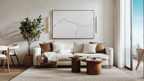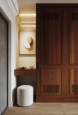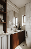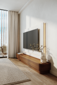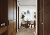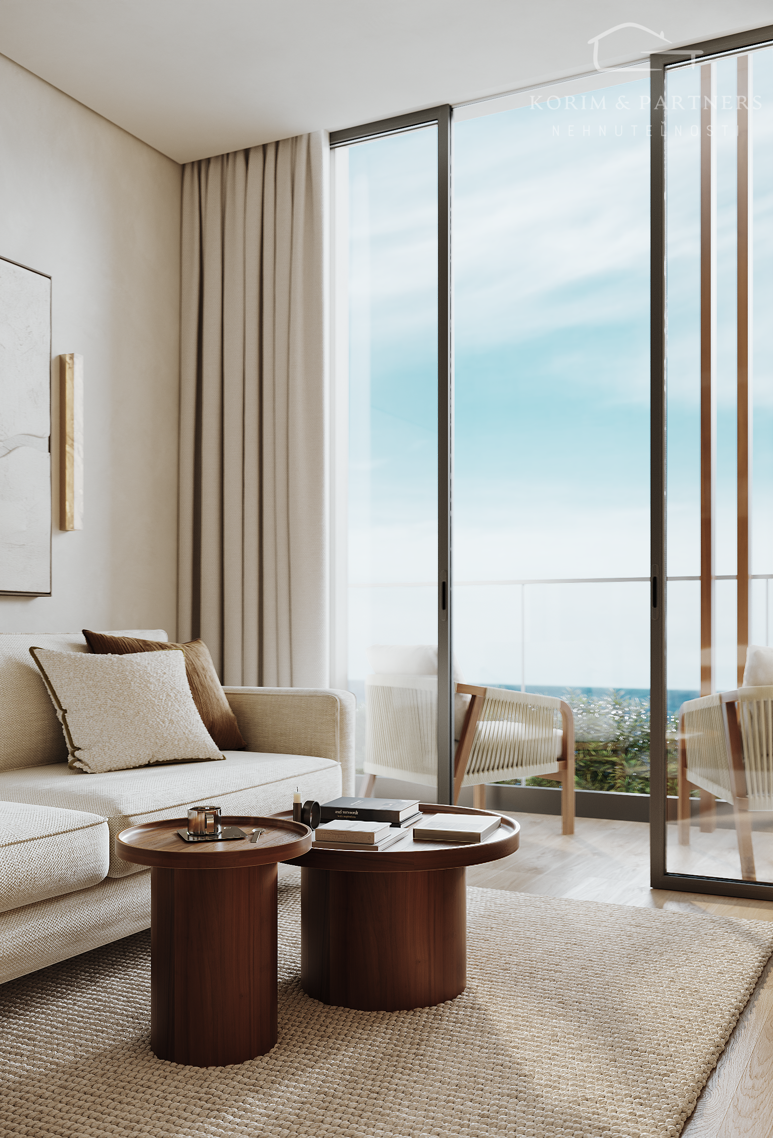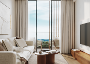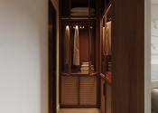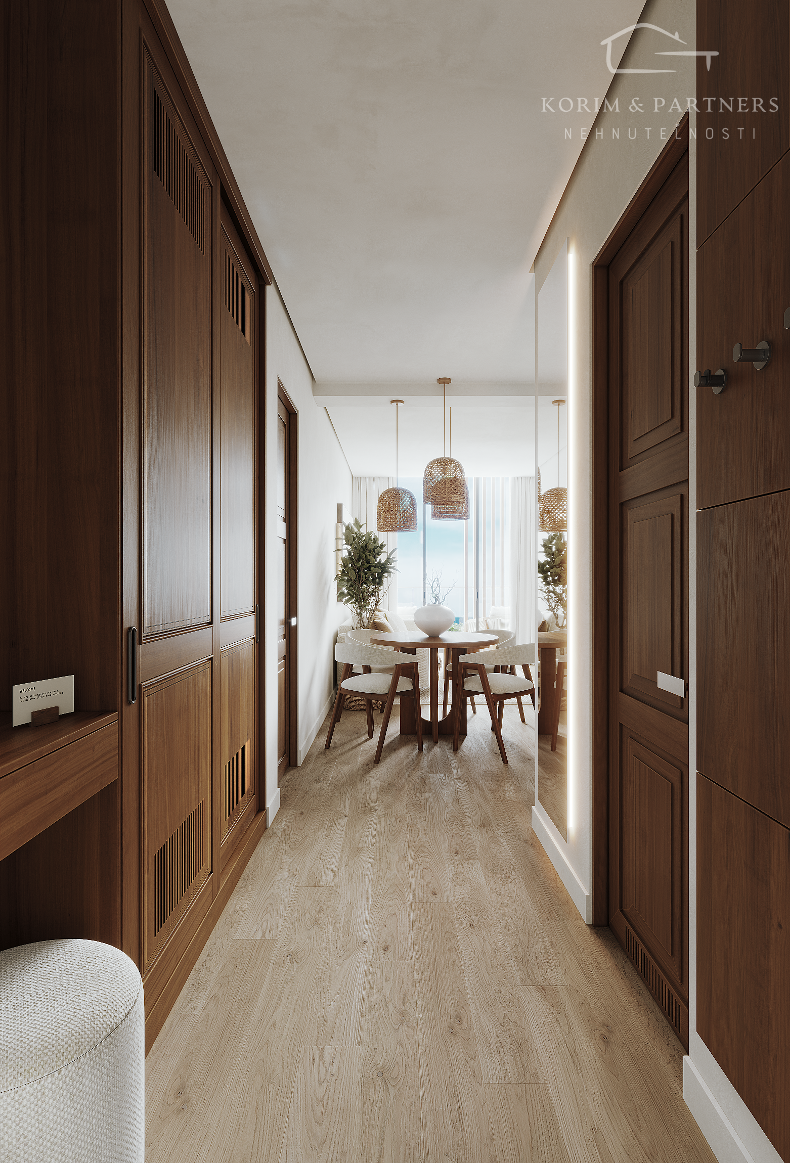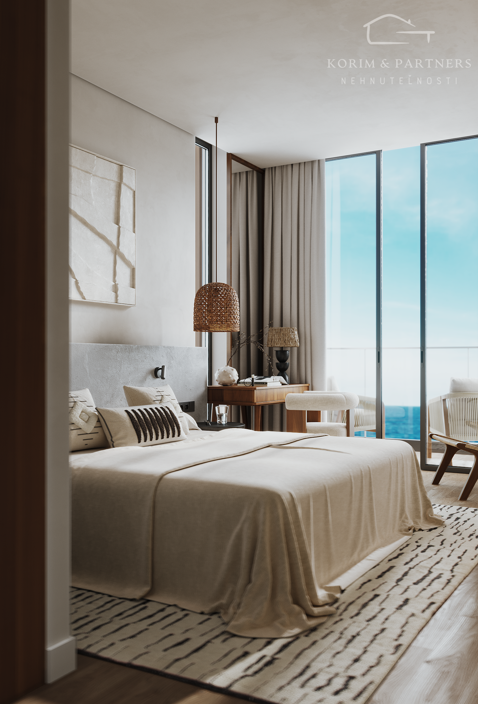 Tento moderný apartmán pozostáva z predsiene, pri ktorej sa nachádza samostatné WC. Prechod z preciene Vás privedie plynulo do kuchyne spojenej s obývačkou, na ktorej konci sa nachádzajú panoramatické okná s posuvnými dverami, ktoré vedú na balkón, na ktorý je zároveň vstup aj z vedľajšej izby. Prejdením z obývačky do spálne sa pred Vami otvorí priestor spálne spojenej so šatníkom, vedľa ktorého je druhá kúpeľňa.