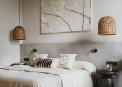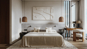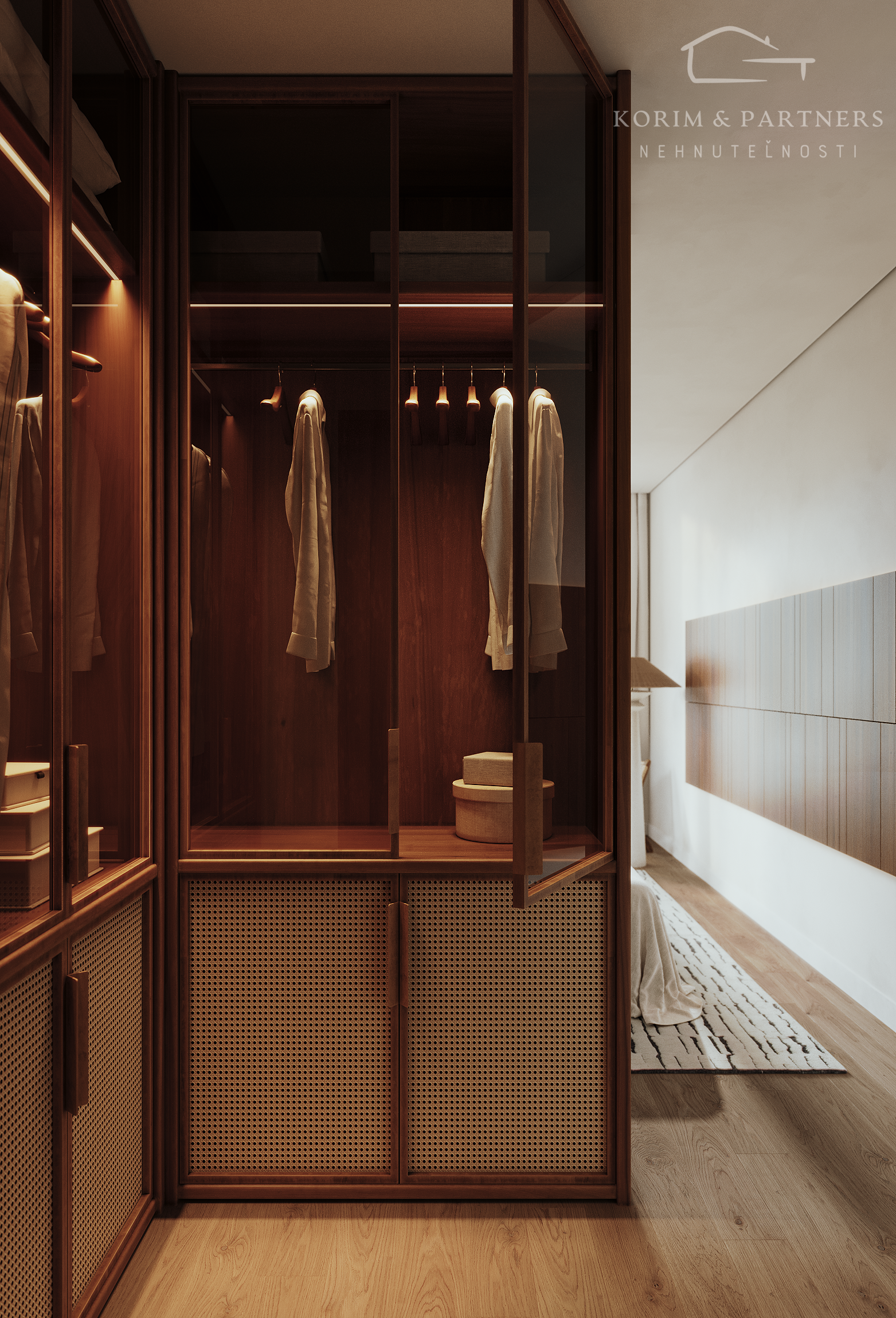 - Spálňa s „walk-in“ šatníkom, manželskou posteľou a pracovným stolom s pohodlnou stoličkou.