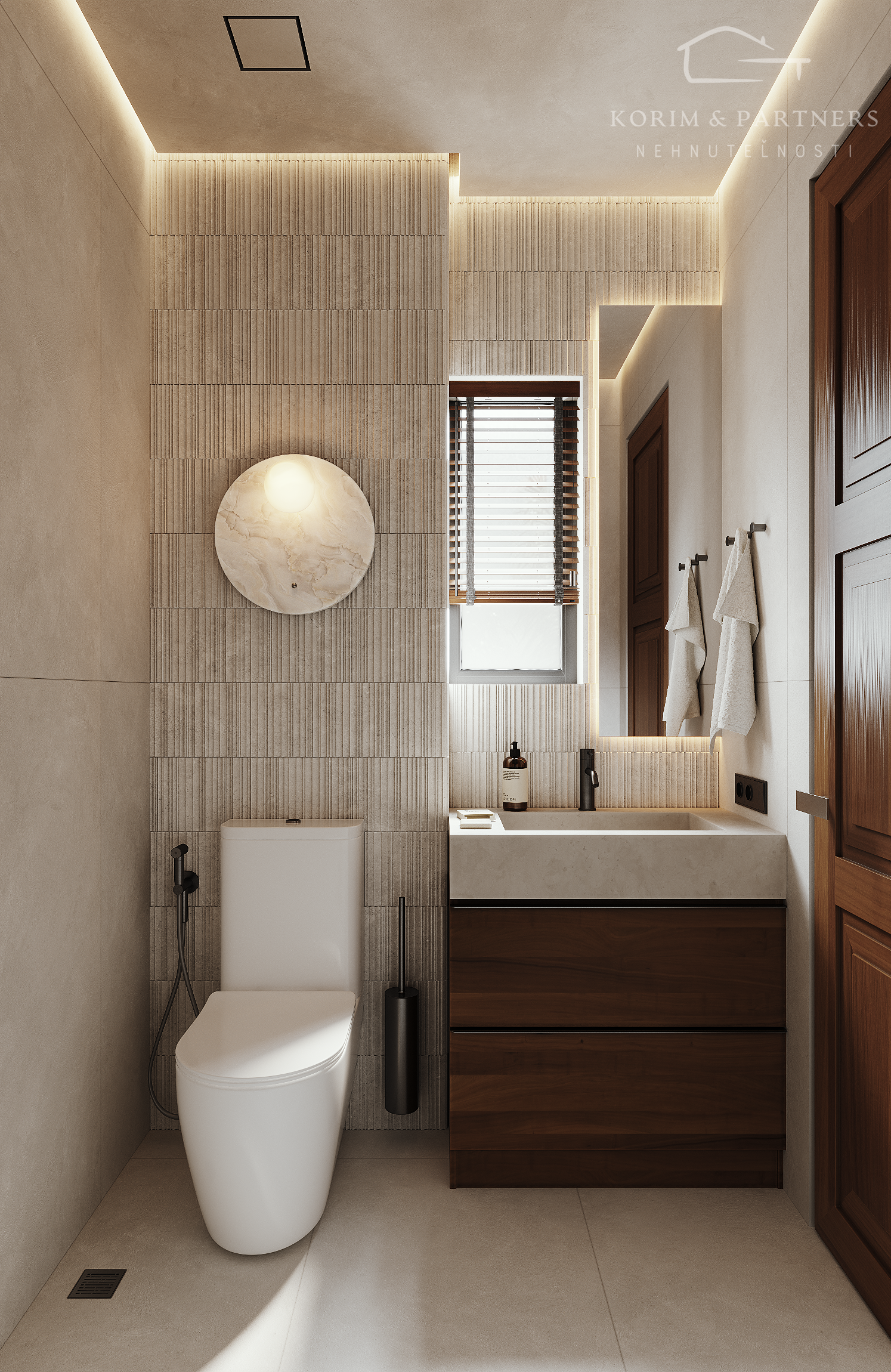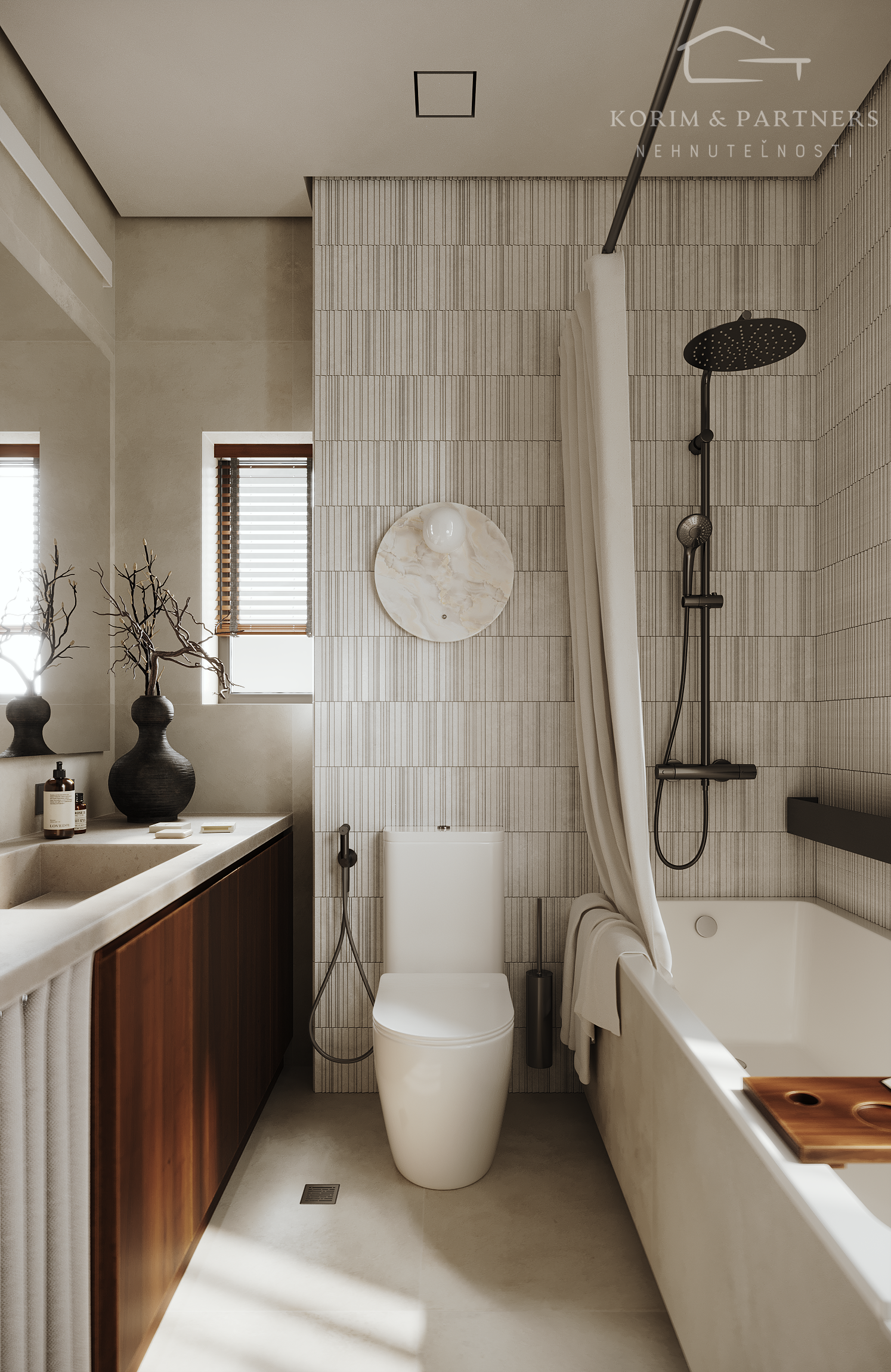 - Kúpeľňu s ďalším WC, umývadlom a vaňou so sprchovou hlavicou.