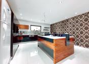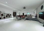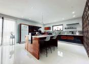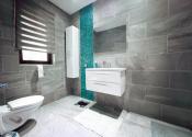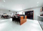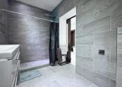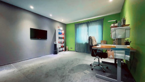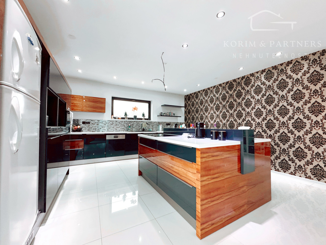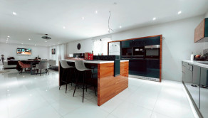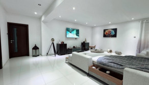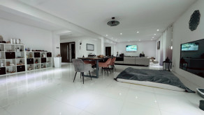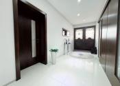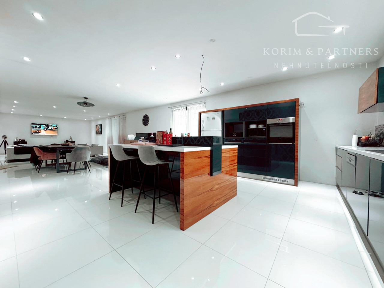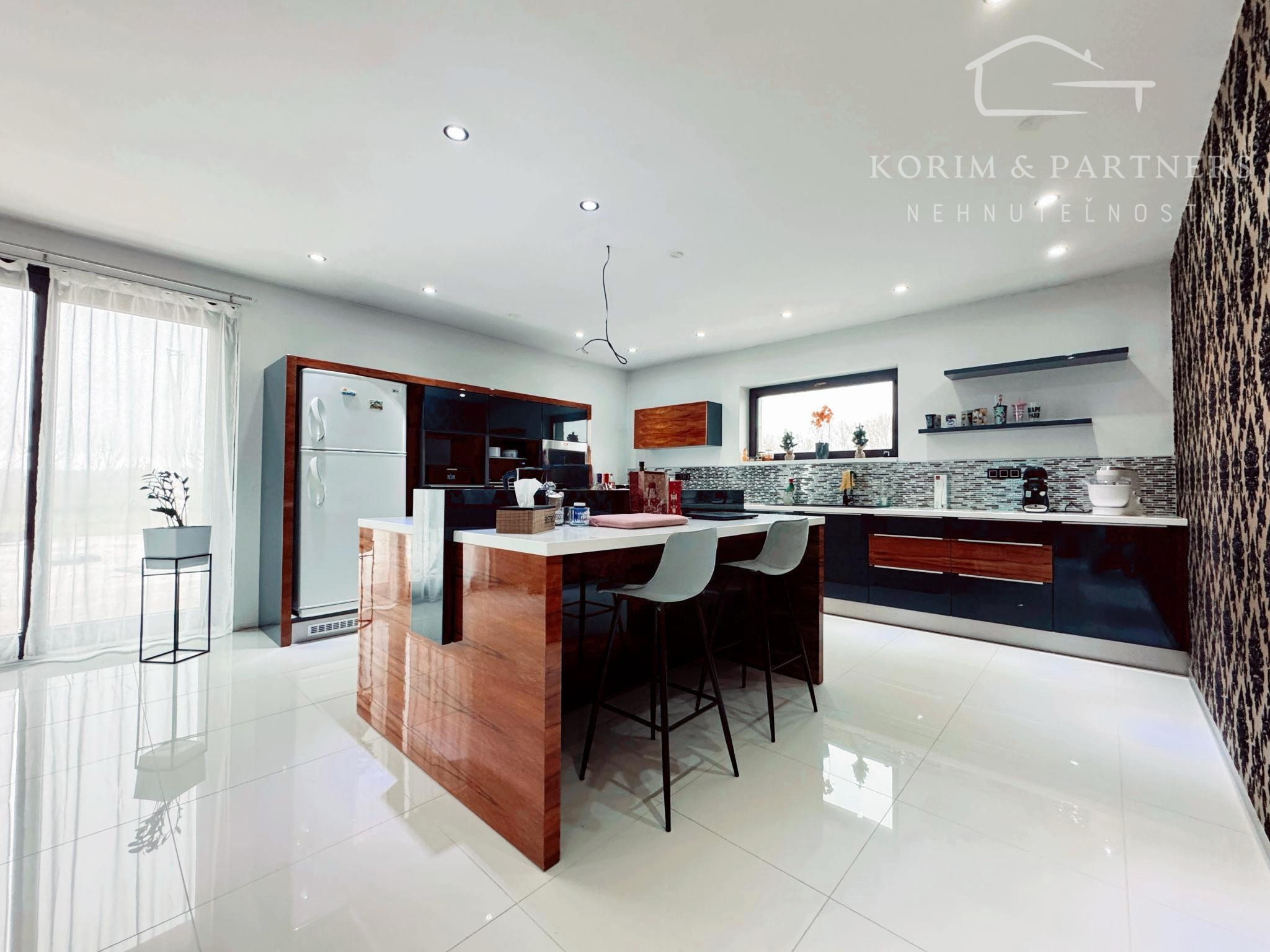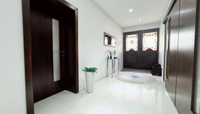 Vstupná chodba vedie do centrálneho obytného priestoru, ktorý je srdcom celého domu a denne pulzuje Vašou energiou. Pozostáva z obývačky, jedálne a kuchyne v jednom na ploche približne 100 m2. Kuchynská linka a kuchynský ostrovček sú vyrovené z indickej jablone, doplnené elektrospotrebičmi zn. Siemens určeného na nemecký trh. Napravo od vchodových dverí je samostatná izba a naľavo kúpeľňa so sprchovacím kútom a WC. Vedľa nej je šatník. Ďalšia izba je pri kuchyni, jej súčasťou je ďalší samostatný šatník. Na opačnej strane je pri obývačke kúpeľňa nadštandardných rozmerov (zatiaľ predpríprava) a spálňa so samostatným šatníkom, za ktorým je technická miestnosť a práčovňa v jednom. Z jedálne vedú terasové dvere na terasu aj ku krytému bazénu a domácej posilňovni. Terasové dvere ako aj okná sú tiež z dreva Meranti a dokonale presvetlujú priestor krytého bazénu od terasy ako aj celého domu.