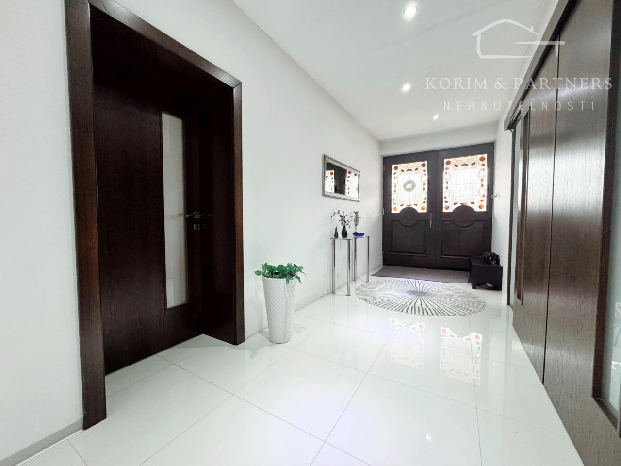 Do domu vstupujete cez ručne vyrobené masívne dvere z afrického dreva Meranti, doplnené o dizajnové presklenie tiffany. Ich precízne vyhotovenie je prvým signálom, že dom vznikol s ambíciou ponúknuť niečo viac než len bývanie.