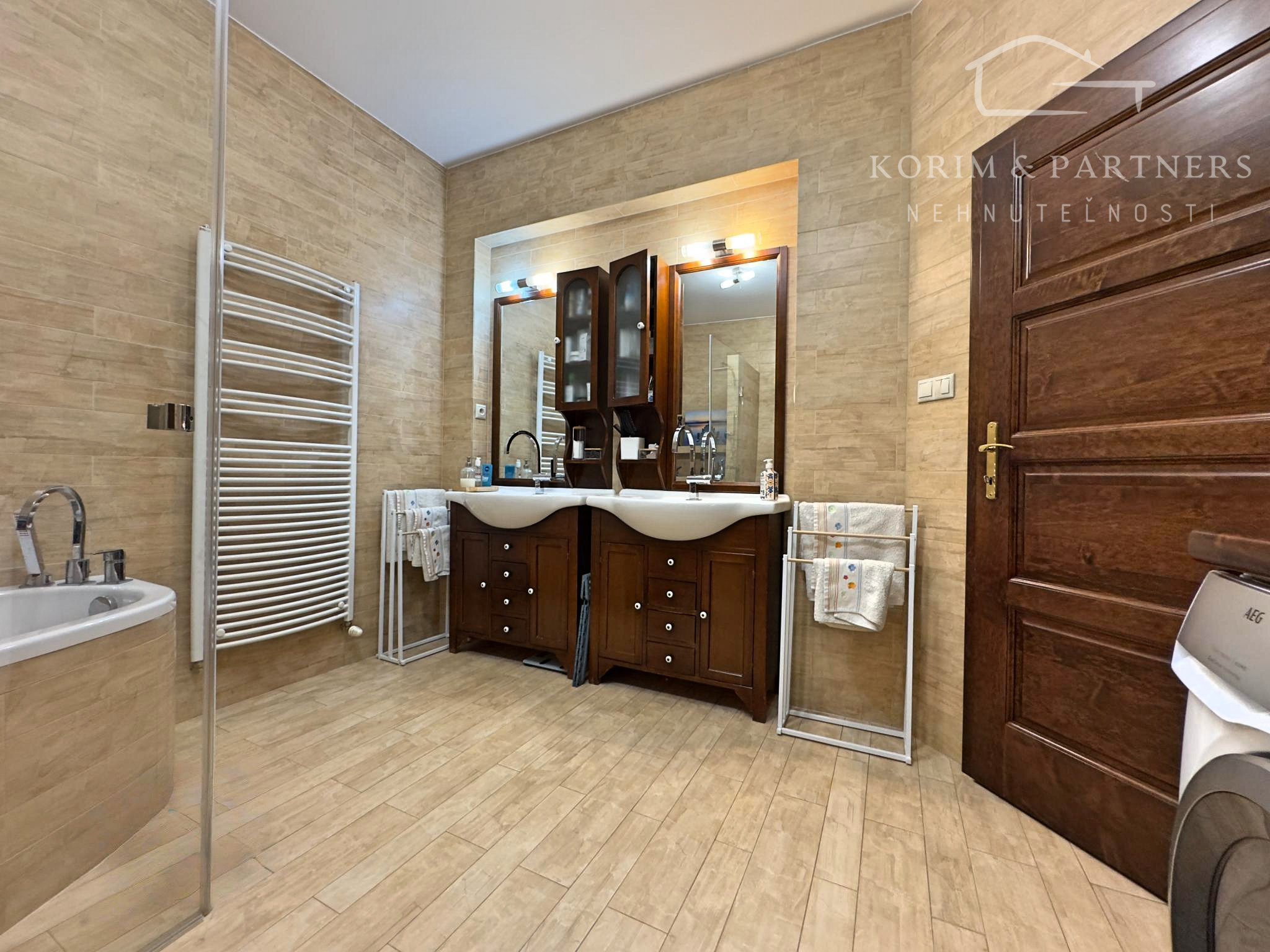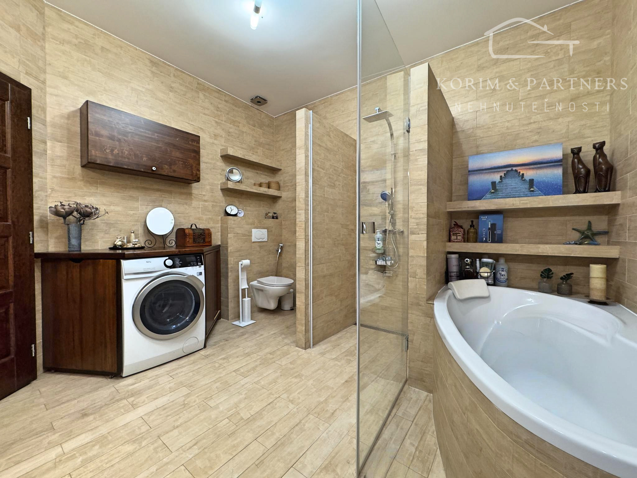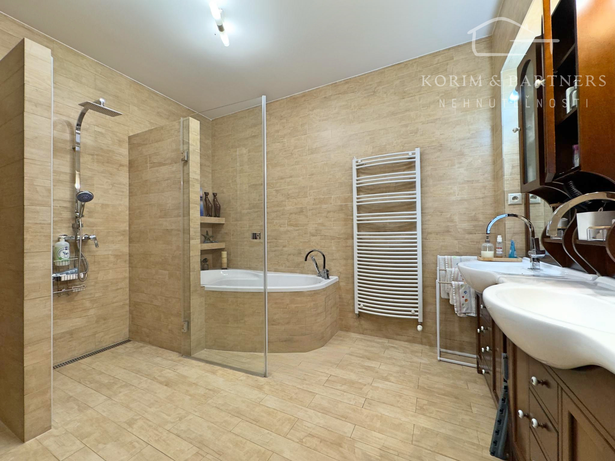 Podlahy: Kombinácia prémiovej drevenej podlahy (pocit tepla) a kvalitnej dlažby (vysoká odolnosť).