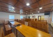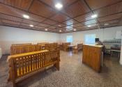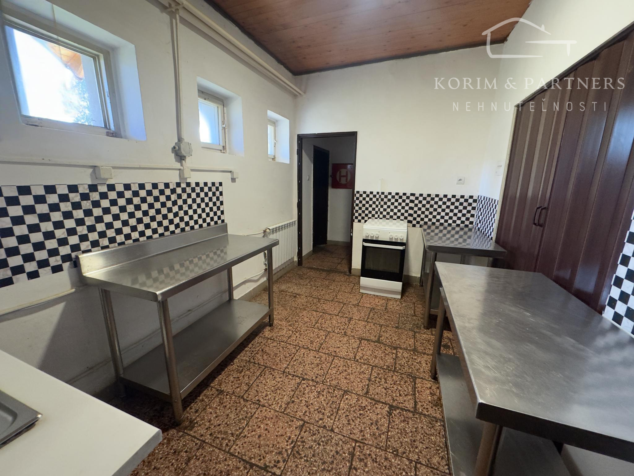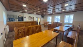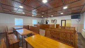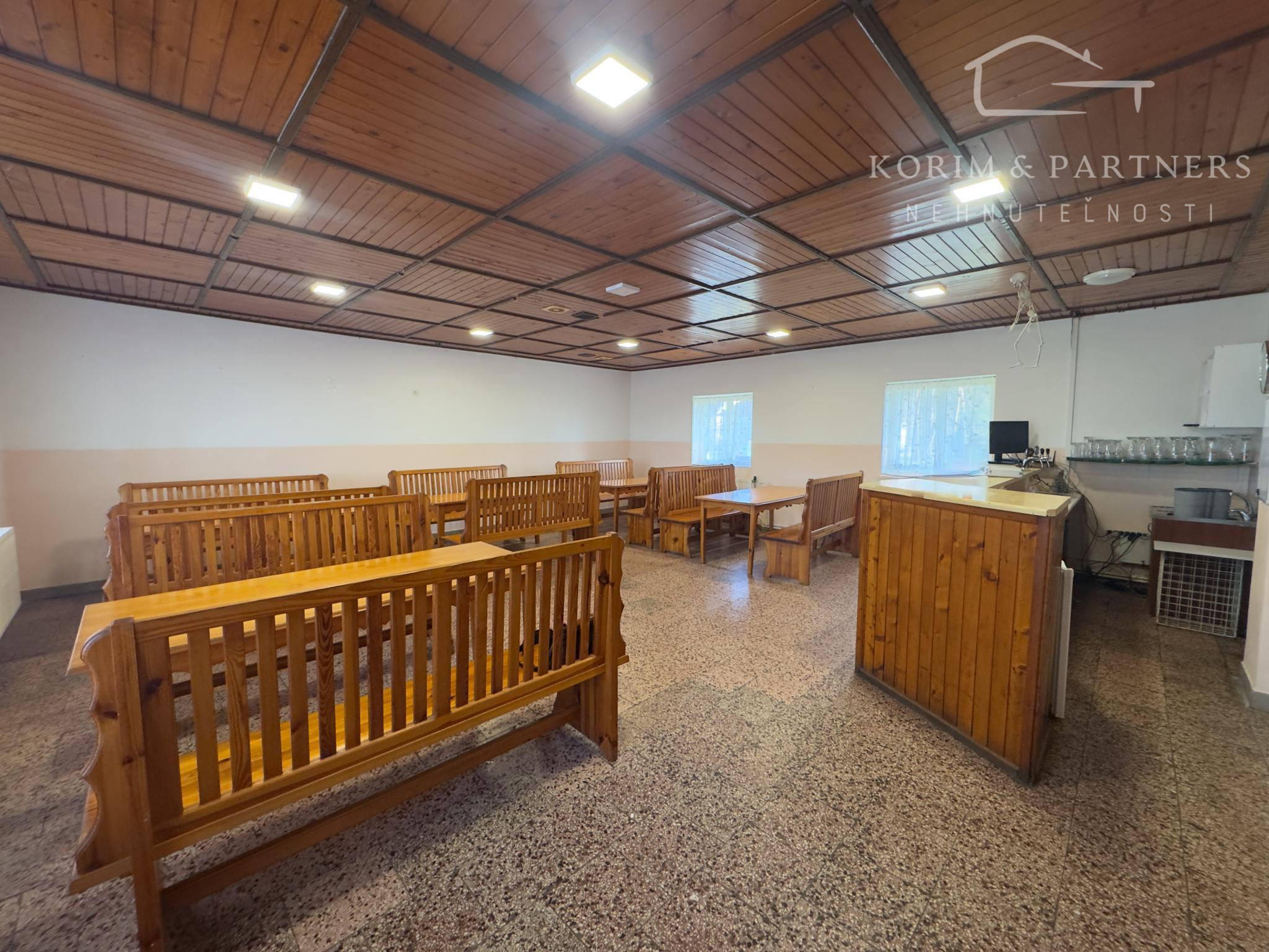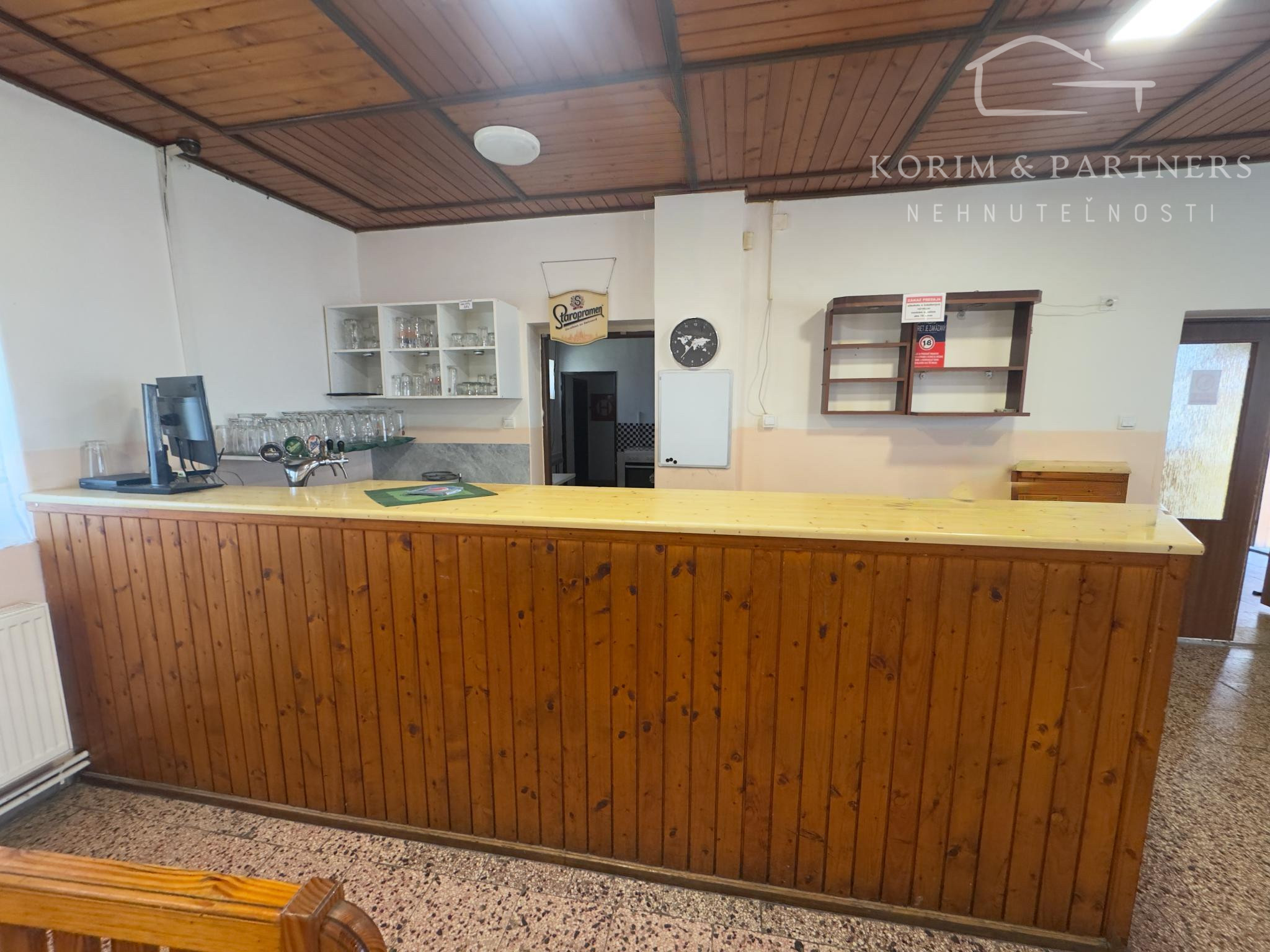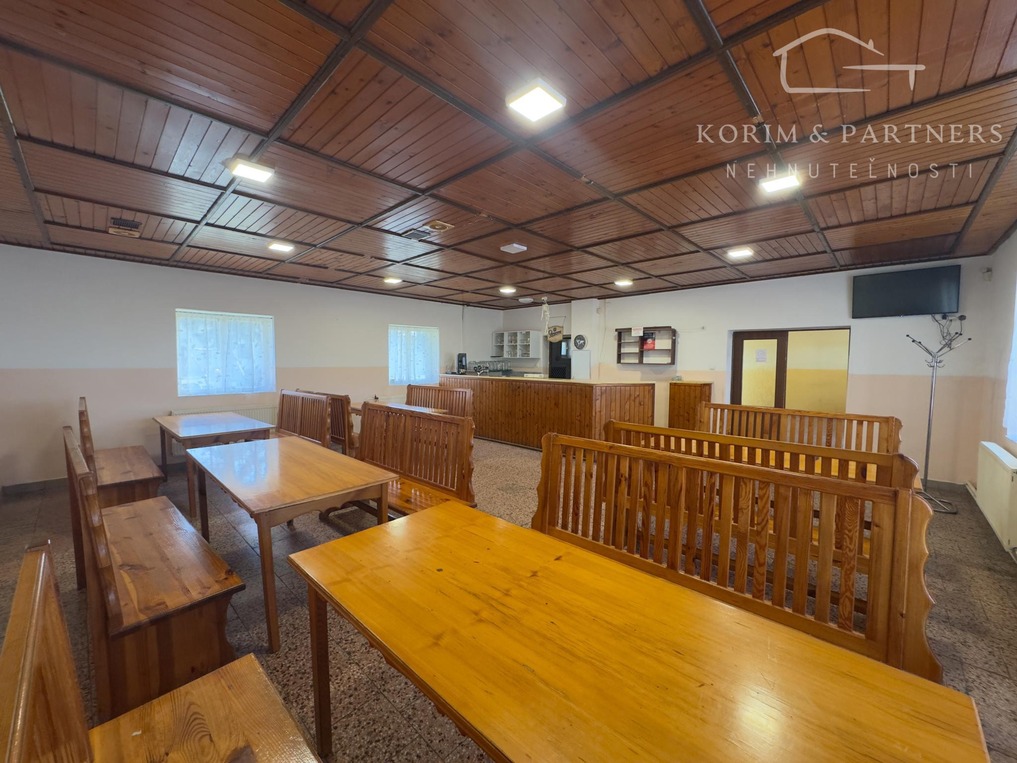 Masívny interiér s dreveným sedením. Stabilný bar. Výčapná časť. Kuchynské zázemie. Sklady. Sociálne zariadenia. Všetko pripravené na okamžité pokračovanie prevádzky.