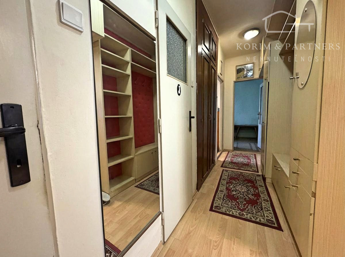 Zo vstupnej chodby sa dostanete do všetkých miestností bytu. Hneď napravo od vchodových dverí sa nachádza priestranná obývačka s balkónom a výhľadom do okolia. Za ňou je ďalšia podobne veľká izba, ktorá môže slúžiť ako spálňa.