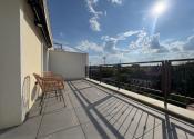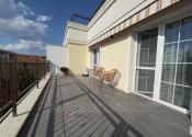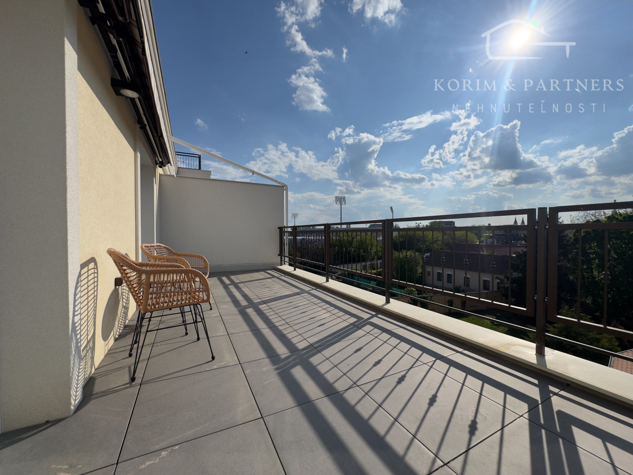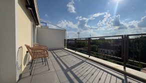 Dispozícia je veľmi praktická, pretože hneď ako všetky časti tohto bytu dávajú zmysel. Pri predsieni je WC a kúpeľňa, hneď za ňou je napravo kuchynský kút a napravo obývacia časť. Pri nej je ďalej pracovný kút a spacia časť. Z oboch strán máte dvere na veľkú terasu, ktorú určite využijete od aj niekoľko mesiacov do roka. A ak by Vám to nestačilo ešte väčší priestor Vám poskytne zelená strecha.